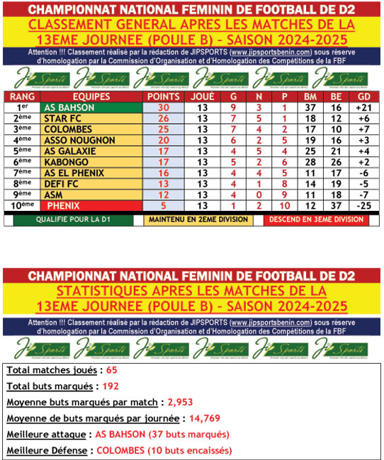 RESULTATS DES MATCHS DE LA 13EME J CHAMPIONNAT FÉMININ DE