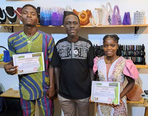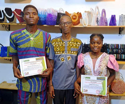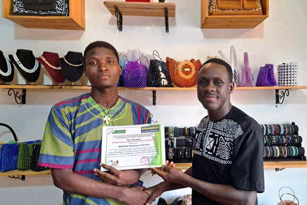 Les deux apprenants en fin de formation entouré leur parrain Abdias