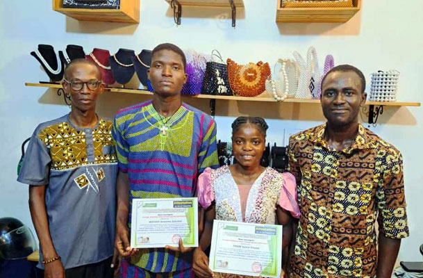 Les deux apprenants en fin de formation entouré leur parrain Abdias